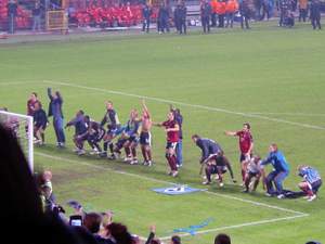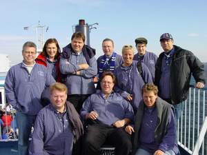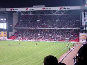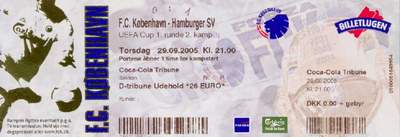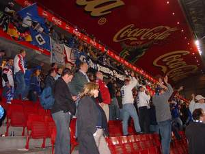 Die „Coca-Cola-Tribüne“ mit den HSV-Fans Zum Spiel lässt sich nicht viel sagen, es war eine einzige Zitterpartie und gegen das Abwehr-Bollwerk der Dänen war es verdammt schwer, eine Lücke zu finden. Mir fallen dazu nur zwei Sprüche ein: wer ist eigentlich Barbarez und was war das bitte für ein Schiri ?. Letztendlich und voller Glücksgefühle siegten wir dank dem Schiedsrichter und Van der Vaart durch einen sehr umstrittenen Elfmeter in der 93. (!) Minute mit 1:0. Danach war Party pur angesagt. Die ganze Coca-Cola-Tribüne lag sich in den Armen und sang olé, olé, olé, olé super Hamburg olé !!! Nach endlosen Jubeln ging es zurück zu den Autos, wo wir uns natürlich erst mal ein Sieger-Schlückchen genehmigten und uns für die lange Rückfahrt stärkten. Gegen 0.15 Uhr traten wir unsere Rückreise gen Hamburg an. Nach kurzer Abstimmung entschieden wir uns, wie schon auf dem Hinweg, für die Fähre. Rechtzeitig zur Abfahrt der Fähre um 2.15 Uhr erreichten wir Rödby. Besser geht’s nicht ! Sehr glücklich und sehr müde erreichten wir den Stellinger S-Bahnhof um 5.15 Uhr in der Früh. Ein großes Dankeschön geht an die beiden Fahrerinnen Iris und Gabi, die uns sehr sicher und souverän nach Kopenhagen und zurück gebracht haben. Ich denke, die Beiden waren die einzigen, die auf der Rückfahrt nicht die Augen zu machen konnten, um ein paar Minuten wegzunicken. Außerdem vielen Dank an Harald für das leckere Frühstück und natürlich an unseren Präsidenten Birger, der die komplette Fahrt organisiert und geplant hat. Es fehlen Thomas, Stephan R. und Claudia.