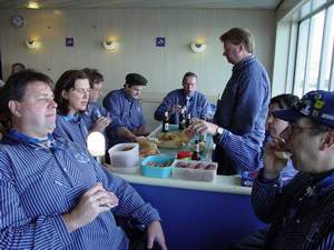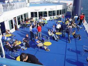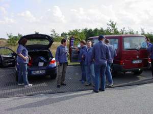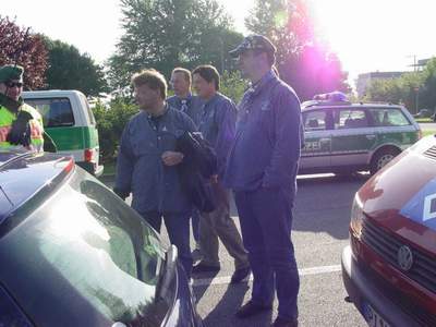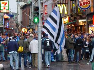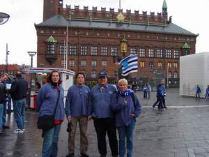 Endlich war es soweit !!!!! Unser Fanclub startet um 8.15 Uhr vom Stellinger S-Bahnhof zu seiner ersten internationalen Auswärtsfahrt. Allen 11 HSV-Fans ist die Spannung anzumerken, erst recht unseren Präsidenten Birger, der um kurz nach acht schon wie ein wild gewordenes Rumpelstilzchen umher rennt und sich fragt, wo nur die beiden Schleswig-Holsteinerinnen Gabi und Steffi bleiben. Es war gar nicht so einfach bei diesem Mega-Stau auf der A23 und A7 rechtzeitig am Treffpunkt zu sein. Aber um 8.10 Uhr waren wir auch endlich eingetroffen. Zum Glück sollte das unser einziger Stau bleiben. Nun ging alles ganz schnell, rein in die beiden Autos und ab auf die A1 Richtung Puttgarden zur Fähre nach Rödby. Dort angekommen um 10 Uhr wurden wir von zahlreichen Polizisten des Bundesgrenzschutzes begrüßt. Alle Ausweise wurden gnadenlos durch die EDV geprüft. Nach positiver Kontrolle verließen wir um 10.45 Uhr mit vielen weiteren HSV-Fans den deutschen Boden Richtung Dänemark. Birger hatte für die Hinfahrt 2 Plätze für die Fähre reserviert, auf der Fähre wir uns uns dann mit dem Super-Frühstück von Harald stärkten, echt lecker ! Kaum waren wir mit dem Essen fertig, legten wir auch schon in Rödby an. In Dänemark hatten wir noch 170 km bis Kopenhagen zu fahren. Nach hundert Kilometern steuerten wir eine Raststätte an, um uns ein wenig die Beine zu vertreten. Dort hielten auch 2 von den 14 Supporter-Bussen mit überwiegend männlichen Insassen, wie unschwer auf dem Foto zu erkennen ist. Angekommen in Kopenhagen mussten wir 2 Mal nach dem Weg fragen, ehe wir endlich das Stadion „Parken“ des FC Kopenhagen erreicht hatten. Dort hatten wir gleich einen Super-Parkplatz erhascht und waren uns schnell einig, dass wir die Autos hier nicht mehr weg bewegen. Also ging es zu Fuß los. Erster Halt war direkt am Stadion im Fan-Shop „Super Shoppen“ des FC Kopenhagen. Ausgestattet mit FCK-HSV Schals und diversen Pins ging es weiter Richtung Innenstadt. Birger hatte beim Hinspiel 2 Dänen kennen gelernt, die uns einen Kneipen-Tipp gegeben haben, wo sich vor dem Spiel ein paar Fans trafen. Also hin da! Die Kneipe „Stalingrad“ erinnerte uns eher an Kneipen aus den alten Zeiten des Kiez. Dort stärkten wir uns mit einer kalten „Hopfenschorle“ à la Carlsberg. Fünf Waterkantler war es zu eintönig, den Nachmittag in einer Kneipe zu verbringen, so machten sie sich auf den Weg in das Zentrum, um zu sehen was die anderen zahlreichen HSV-Fans dort auf dem Rathausmarkt veranstalteten. Je näher wir kamen, umso lauter wurden die Gesänge der HSV-Fans. Es war schon eine Menge los in der Fußgängerzone und es machte Spaß, den Fans zuzusehen.