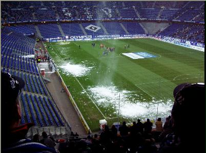 Es war nicht so der Hit, was sich das Hamburger Krisenmanagement da heute geleistet hat. Die Fans durften vor dem Stadion warten, weil das Dach noch von der Schneelast befreit werden müsste. Offensichtlich waren die HSV-Verantwortlichen erst nach dem Schneebrett, dass am Vortage in Wolfsburg auf das Spielfeld gefallen war auf die mögliche Gefährdung aufmerksam geworden. Die sehr ruhig bleibenden 44.460 Fans haben die 75 minütige Verspätung bei eiskaltem Winterwetter ganz ruhig und diszipliniert zur Kenntnis genommen.