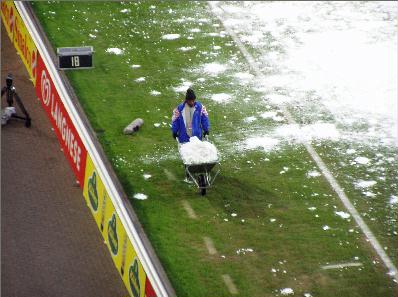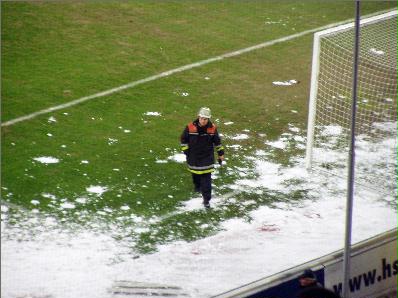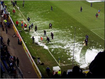 Nur der Hochrettung der Hamburger Feuerwehr ist es zu verdanken, dass das Spiel überhaupt angepfiffen wurde. Liebe Verantwortliche, ihr habt wahrhaft vorausschauend gehandelt. Es hatte seit zwei Tagen in Hamburg nicht mehr gescheit und Tauwetter war auch nicht angesagt. Übrigens hatte Schiedsrichter Wack die Vereinsführung bei seiner Stadionbegehung um 10:30 Uhr auf die Gefährdung hingewiesen. Aber reagiert hatte dort niemand. Einige tausend Liter Glühwein frei für die Fans wären aus unserer Sicht für diese Schlamperei eigentlich angemessen.