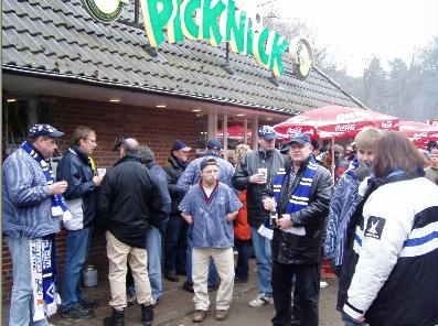 Brr, war ein richtig typisches Hamburger Schmuddelwetter heute. Es war gar nicht so einladend vor dem Spiel zum Picknick zu kommen. Aber der harte Kern wollte sich die Fachdiskussionen in Vorbereitung auf das heutige Bundesligaligaduell gegen die im Mittelfeld rumdümpelnden Dortmunder nicht entgehen lassen. Als zusätzliche Motivation für das rechtzeitige Erscheinen gibt es ja auch immer ein (oder auch zwei) Bierchen.