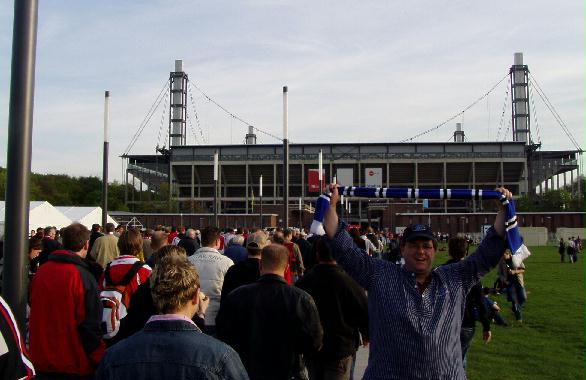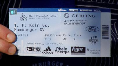 Das Rhein-Energie-Stadion! Eine wirklich schicke Arena der neuen Bauart. Nicht rund gebaut, wie die meisten anderen Fußballtempel der Neuzeit, sondern recht eckig gehalten. Das Spiel gegen den HSV wollten 50.000 Fans sehen. Das Stadion war damit ausverkauft. Übrigens waren Gladdy und ich uns einig. Hier gibt es die besten Bockwürstchen, die wir jemals auf einer Auswärtsfahrt gegessen haben und die 1,80 € dafür sind auch noch im Vergleich zu anderen Arenen sehr preiswert. Genau wir in unserem Wohnzimmer, der AOL-Arena, gab es vernünftige Sitze und keine Klappsitze.