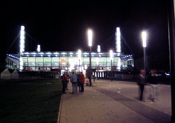 Das Rhein-Energie-Stadion vor dem Spiel und nach dem Spiel. Beeindruckend sind die vier beleuchteten Ecktürme. |