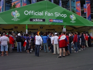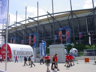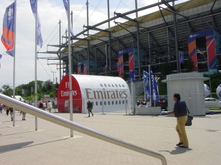 Unser gesamtes Stadion war verhüllt mit zahlreichen Logos und Stoffen vom „Fifa World Cup Germany 2006“. Nur die Schilder für den „HSV-Store“ und das HSV-Museum“ waren zu sehen. Ausserdem mussten sämtliche Fan-Shops den Platz für die Fan-Artikel der WM 2006 räumen. Unser neuer Sponsor „Fly Emirates“ war auch mit einem Zelt in Form eines Flugzeugrumpfs präsent. | |