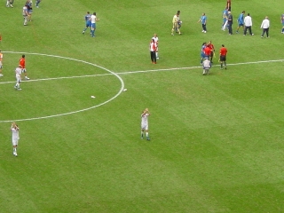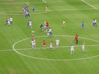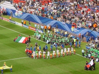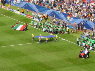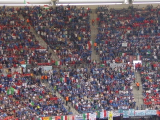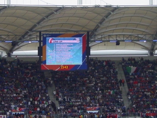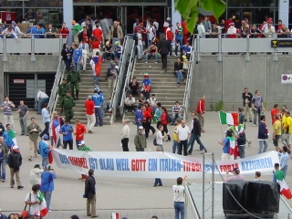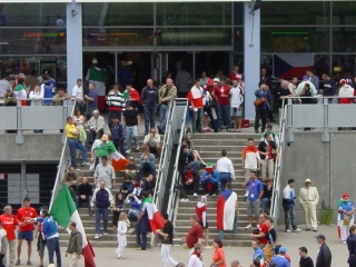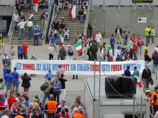 Zur Organisation ist vorweg schon mal zu sagen, dass alles ohne Probleme ablief. Keine langen Schlangen an den Einlässen, gute schnelle Personenkontrolle, rundum alles in Ordnung. Unbedingt erwähnenswert ist aber die absolut geniale Stimmung. Alle Fans, ob italienisch, tschechisch oder deutsch waren gut gelaunt und alle wollten einfach nur Fußball sehen und Spaß haben. |