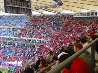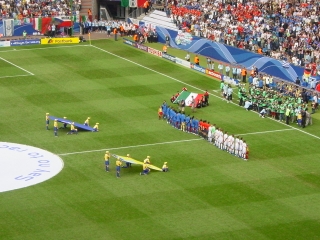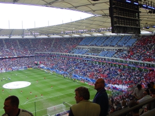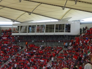 Im Gegenteil zu den Mannschaften zeigten sich die Fans in bester Spiellaune, wobei die Tschechen klar besser waren. Zahlreiche Fans (vielleicht HSV-Fans ;-) ) versuchten zig Mal die Welle durchs Stadion laufen zu lassen. Doch leider kam diese aufgrund des Spiels nur ein Mal zu Stande. | |