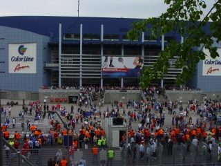 Weiter ging es in Richtung Stadion. Vor dem Stadion war schon reichlich Stimmung und natürlich jede Menge Fans der beiden Mannschaften anwesend. Die CoLinA hatte ihre Tore auch geöffnet, um durstige Kehlen zu löschen. | |