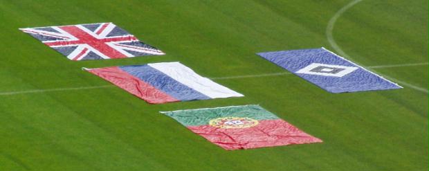 Ausblick auf die CL-Gruppe des HSV. Die landesflaggen von Arsenal London, ZSKA Moskau und FC Porto. |