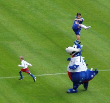 Hier noch ein Bild von Dino Hermann. Der Herthaner Pantelic (tanzt unserem Dino grad auf dem Kopf) zeichnete sich heute nicht nur durch sein Auslassen bester Torchancen aus, sondern seine Eskapaden bei seiner Auswechslung mehrfaches Verbeugen und Zeitschinderei ohne Ende waren eigentlich nicht nur die gelbe, sondern eine Rote Karte wert. |