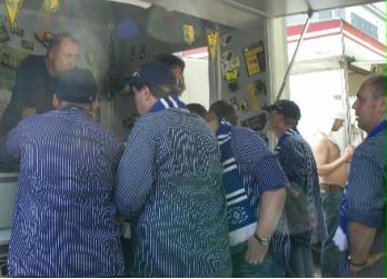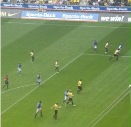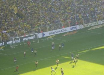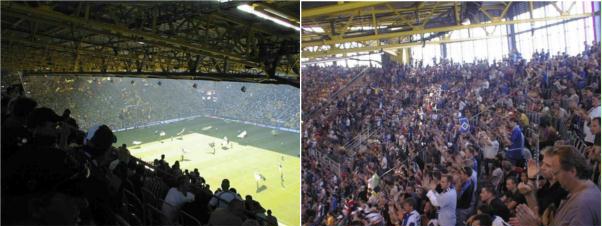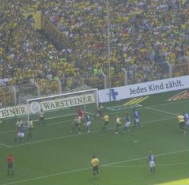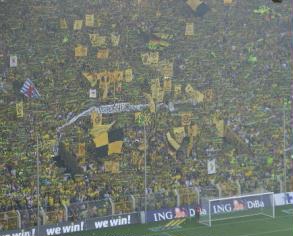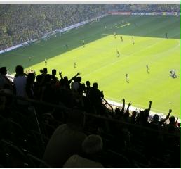 Wir, d.h. 7 Fanclub-Mitglieder und die Gäste Jana und Bernd, trafen uns um 11Uhr an unserer Stammraststätte „Dammer Berge“. Nach der üblichen Stärkung mit dem 2. Frühstück brachen wir in Richtung Dortmund auf. Die Verkehrsanbindung des Westfalenstadions fand ich ganz in Ordnung, man ist relativ zügig von der Autobahn zum Parkplatz gekommen. Dort haben sich einige noch umgezogen, bevor wir dann zum Stadion schlenderten. Vor dem Stadion standen wir noch eine Weile, weil wir auf unser 8.Fanclub-Mitglied Regina und noch einen Bekannten von unserem Präsidenten Birger warteten. Das Stadion war dicht bewachsen von Bäumen, weswegen ich auch von außen keine Fotos gemacht habe. Im Stadion sahen wir gleich die Südtribüne, auch genannt „Gelb-Schwarze Wand“. Ich fand diesen Eindruck nicht so imposant, wie mir im Vorfeld von Bekannten berichtet wurde .Vielleicht lag dies auch daran, dass unsere Plätze soweit oben waren und das Stadiondach den Blick auf die Südtribüne einschränkte. |