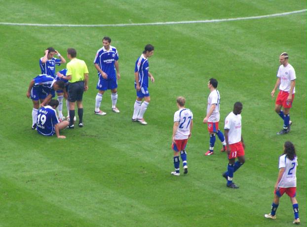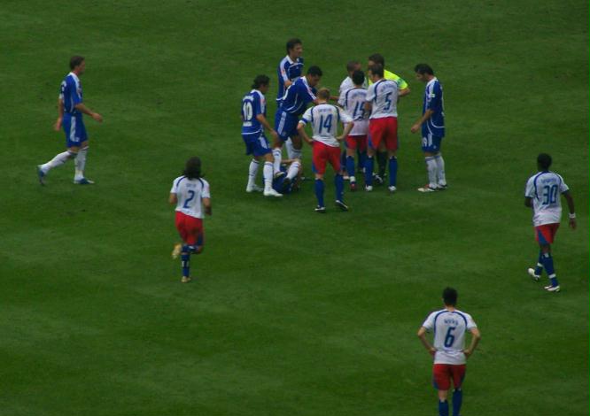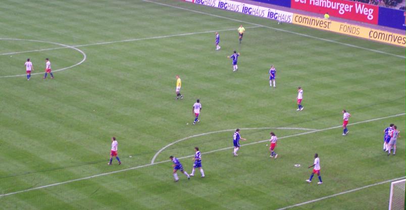 Die meisten gucken zweifelnd in Richtung Halbzeit Zwei. Wieder mal nur noch 10 HSVer auf dem Spielfeld. | |
