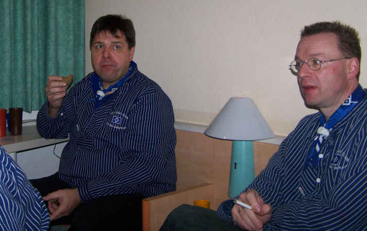 Nach dem Spiel sind wir zum Hauptbahnhof zurückgelaufen und unsere mit öffentlichen Verkehrsmitteln bestens bewanderte Regi übernahm die Führung, mit der S-Bahn ging es zum Südbahnhof zurück. Dort um die Ecke erwartete uns schon das Hotel. Rechtzeitig zum Beginn der Sportschau waren wir da. Der "kleine" Niels hatte lecke Frikadellen dabei, die ein willkommene Stärkung boten. Daneben wurde der traditionelle Whisky-Cola zu uns genommen. |