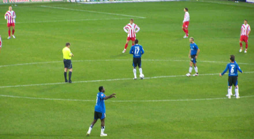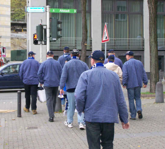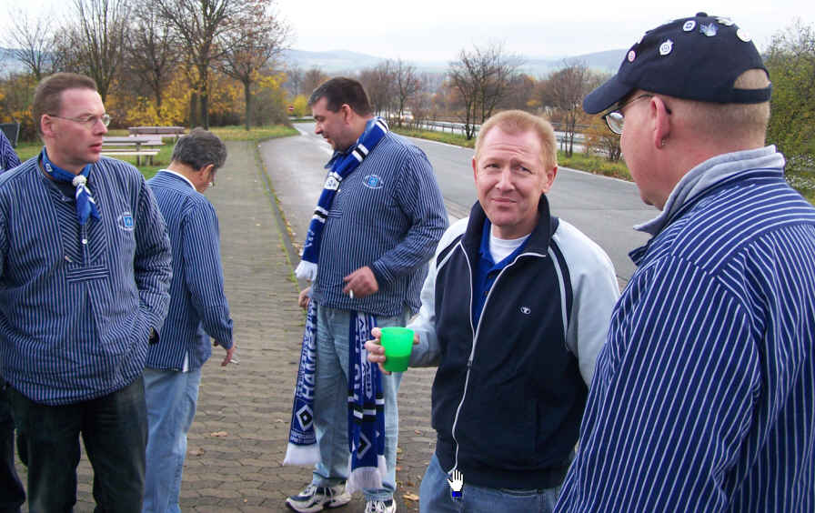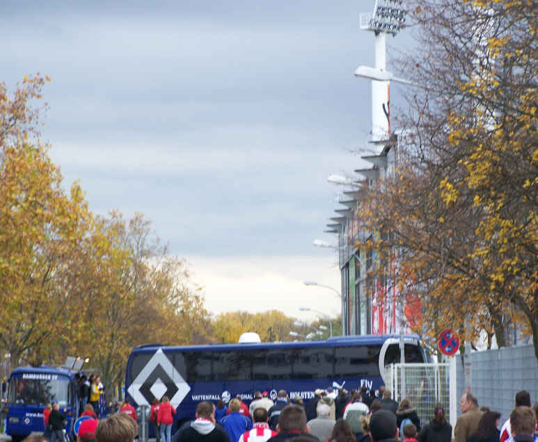 Auf dem Weg zum Treffpunkt kam das HSV-Team gerade an. Der Gästebus fährt immer direkt auf das Stadiongelände. Der Bus des Heimteams hält direkt am Stadion und man kann Trainer und Spieler aussteigen sehen. Sie gehen dann direkt zwischen den Fans durch in die Umkleiden. War interessant einmal so etwas zu beobachten. | |