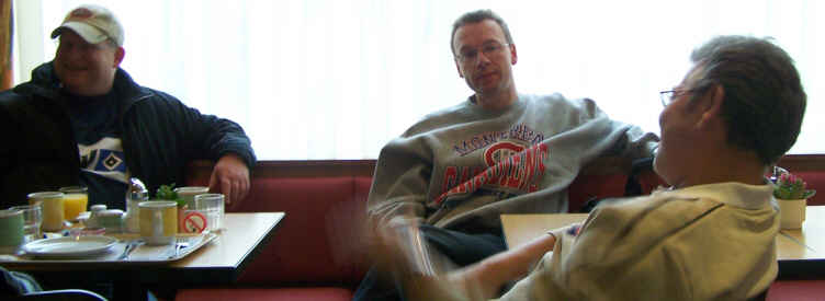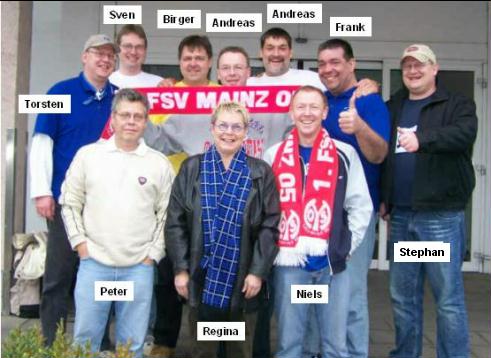 Zu Birger, Niels, Stefan, Sven, Peter, Torsten, Frank, Andreas und Andreas ist in Mainz auch Regina (Bildmitte) aus Bielefeld dazu gestoßen, jetzt waren wir komplett. | |