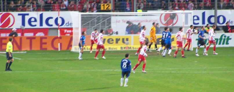 Aber unsere Freunde von den "Edelreservisten" haben uns da aus der Patsche geholfen. Ein Edelreservist ist dann schon hineingegangen und hat uns die ersehnten Pins besorgt und durch den Zaun gereicht. Er hat uns die Pins übrigens nicht nur besorgt, sondern auch jedem von uns einen Mainz-Pin geschenkt!!! Also Torsten, nochmals vielen lieben Dank dafür. |