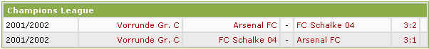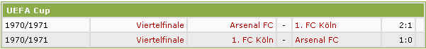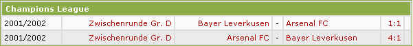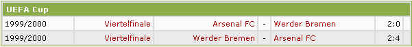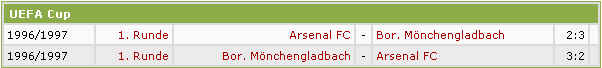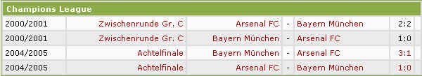 Arsenals deutsche Gegner Bisher hatte es der FC Arsenal mit 10 verschiedenen deutschen Gegnern auf europäischer Ebene zu tun. Bis heute kam es zu 21 Duellen. Insgesamt sieht die Bilanz für Arsenal mit 11 Siegen, 3 Unentschieden und 7 Niederlagen bei einer Tordifferenz von 41:30 positiv aus. Hier die Ergebnisse im Einzelnen: |