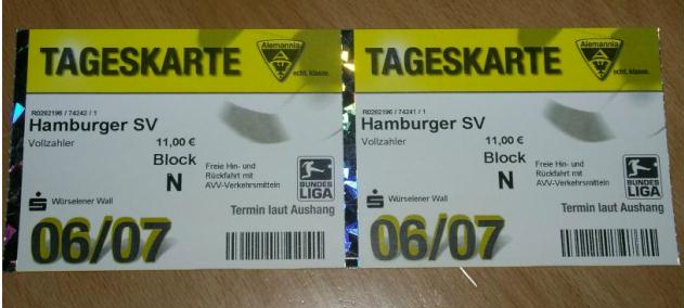 Ein Fußballspiel auf dem Aachener Tivoli hat mich seit langem interessiert. Die angeblich sagenhaften Stimmung dort wollte ich endlich mal live erleben, mit drei Punkten für den HSV. Da ich über den HSV keine Tickets im Hamburger Fanblock mehr erhalten hatte, musste der Online Shop von Aachen herhalten. Aufgrund passender Umstände, ich hatte Urlaub, wählte zufällig genau zum Start des Online Verkaufes der restlichen etwa 100 Karten die Website von Alemannia Aachen an und 2 Std. später war es soweit: ICH HATTE MEINE KARTEN!!! Fauxpas dabei, siehe Tribüne, WÜRSELNER WALL…AACHENFANBLOCK…Heeelp