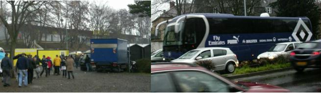 Da sieht man auch schon mal den schicken Mannschaftsbus vom HSV… Haupt - und Gegentribüne sind überdacht, die restlichen Tribünen nicht. |