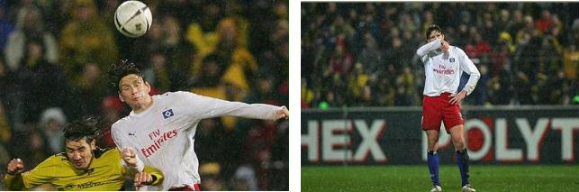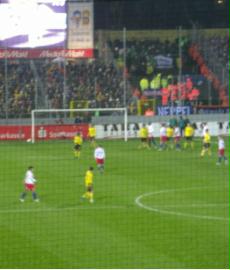 Nach einem Foul von Benjamin in der 2. Halbzeit konnte die Alemannia dank eines Elfmeters in der 62. Minute ausgleichen und anschließend ging es rauf und runter, hin und her und drunter und drüber. Minuten später geht der HSV durch Benjamin erneut in Führung, weitere Minuten später durch Trochowski sogar mit 3:1. Die erstaunlicherweise zahlreich angereisten HSV Fans im Gästeblock waren aus dem Häuschen. Eine Minute später kam Leben in den Tivoli, 2:3. Ich konnte endlich die sagenhafte Stimmung dort erleben, erst recht nachdem Reinhard durch ein unglückliches Eigentor kurz vor Spielende für die Alemannia zum 3:3 ausgleicht. | |