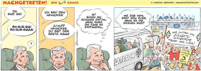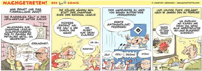 Es zeigt mir, dass doch viele von euch Interesse an unserer Homepage haben. Bevor ich mit euren Erwartungen anfange ein kürzer Rückblick auf die Hinrunde der etwas anderen Art. Auch hier ein besonderer Dank an Christoph Härringer, der es mir gestattet hat, seine Comics hier zu veröffentlichen. Ich finde seine Arbeiten wirklich Klasse. Weiteres von Christoph könnt ihr unter www.nachgetreten.com finden. |