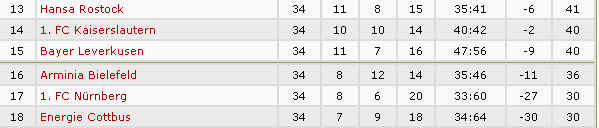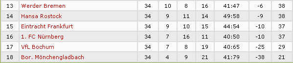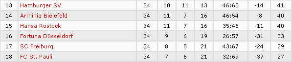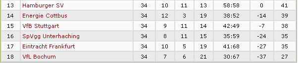 gegen Bayern München sehr gering. Ich glaube einfach nicht mehr daran, dass der solange herbei gesehnte "Befreiungsschlag" noch erfolgt. Meine Hoffnung ist jedoch, das Trainer Thomas Doll konsequenter auf die Spieler reagiert, die nicht zu 100% Leistung für unseren HSV bringen, und endlich mehr Mut beweist, und den jungen Talenten (Laas, Berisha, Hennings, Schmidt) die Chancen ermöglicht die sie verdient haben. Außerdem hoffe ich, dass das Verletzungspech der Hinrunde nicht auch die Rückserie anhält. Mit Torwart Frank Rost hat sich der Verein auf jeden Fall verstärkt und dadurch wird zumindest die Hintermannschaft mehr Stabilität bekommen. Letztendlich kommt es auf einen einigermaßen gelungenen Rückrundenstart an (ich glaube an 5 Punkte aus den ersten drei Spielen), damit nicht bis zum letzten Spieltag gezittert werden muss. Mit mehr als Platz 13 rechne ich jedoch nicht. Unabhängig vom endgültigen abschneiden unseres HSV hoffe ich jedoch, auch weiterhin so schöne Auswärtsfahrten wie Nürnberg, Freiburg und natürlich Mainz erleben zu dürfen. Gruß Niels