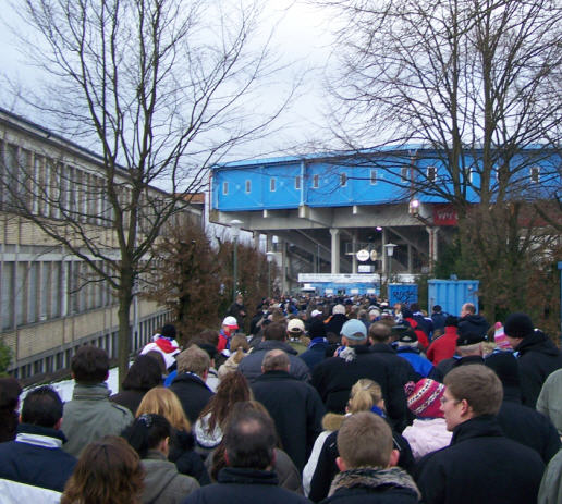 zu markieren. Beim Abmarsch (oder sollte ich es lieber „Trauermarsch“ nennen) nach dem Spiel kochten dann die Emotionen bei einigen Wenigen doch noch mal über und ein völlig unbeteiligt rumstehender Sanitätsbus wurde für die Fehlleistung des HSV mit einem kräftigen Fußtritt bestraft. Ich mag Fußball trotzdem immer noch, habe mich in meinen Vorurteilen bestätigt gefühlt und finde dass es sehr liebe und lockere Fans gibt, die ein solches Ereignis zu einer wahren Freude werden lassen; mit denen man nach dem Spiel Schulter an Schulter (beim Ausgang wird wieder gedrängelt) durch die Straßen schiebt und sich gegenseitig tröstet, aufbaut oder einfach nur nett unterhält. Denn Fußball verbindet auch, was hier in Deutschland ja schon die WM über Gebühr gezeigt hat. Und das ist es was diesen Sport ausmacht und da können diese weniger erfreulichen Begleiterscheinungen auch nichts dran ändern. Und ich werde mich sicherlich gerne noch mal auf das „Abenteuer“ Bundesliga einlassen – wenn Andreas mich noch mal mit nimmt. Mit