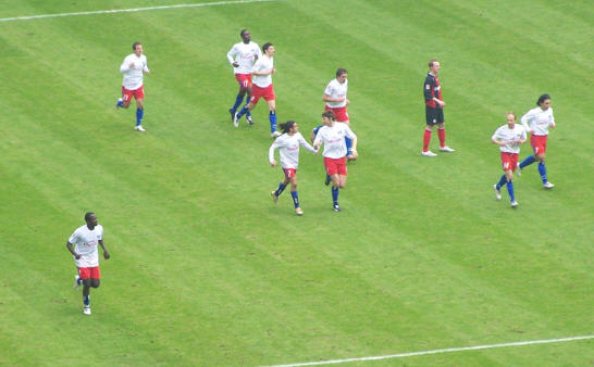 Nach dem Ausgleich wurden die Hamburger nervös. Es gab viele Fehlpässe und man fühlte sich in die Vorrunde versetzt. Zum Glück gab es da den eingewechselten Trochowski, der uns mit einem Supertor , so ähnlich wie sein Treffer im Spiel im letzten Jahr gegen die Bayern, erlöste und zum 2:1 traf. | |