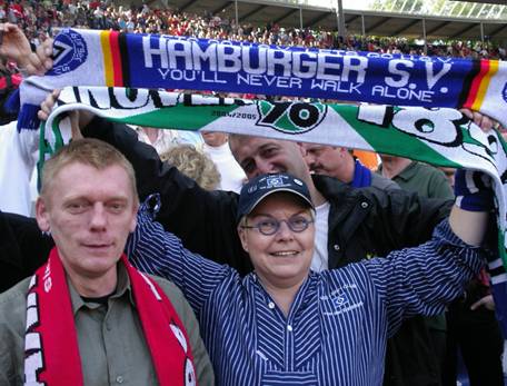 Die Glückwünsche der gegnerischen Fans habe ich wohlwollend entgegen genommen und durfte sogar zwei HSV Schals gegen Hannover Schals eintauschen, aber gerne doch. |