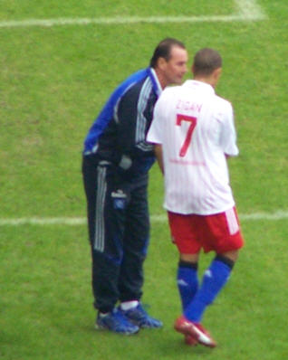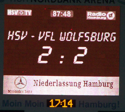 Nach einer eindrucksvollen Choreografie der Nordtribüne zum 120. Geburtstag und 1500 temSpiel des HSV ging es endlich los. Was ist das? Schon eine Minute nach Spielbeginn die 1. Chance für die Wolfsburger, Lattenknaller. Uff, aufamten bei uns, nochmals in der 10. Minute bei einer weiteren Chance der Gäste. Die spielen alles andere als zurückhaltend, kein Respekt vor dem HSV und seinem heutigen Jubiläum. Felix Magath der mit viel Hamburger Applaus begrüßt wurde, hat seine Mannschaft gut eingestimmt. |