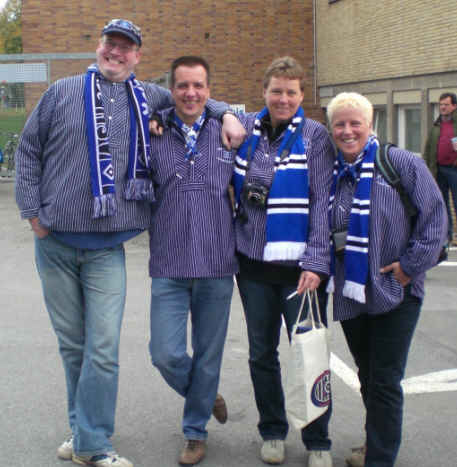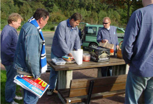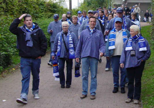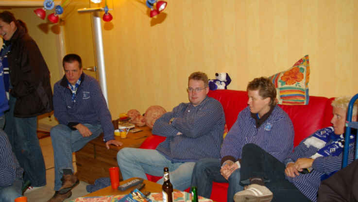 Auf geht es wieder zu mir nach Hause, Bier, Wiskey-Cola und mitgebrachte Knabbereiern warten, ein 3 km Weg vom Stadion wartet und Sven und ich als Vorhut entscheiden „Wir laufen“. Der größte und die kleinste waren die schnellsten, okay, langsam gehen ist net mein Ding | |