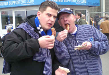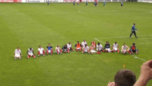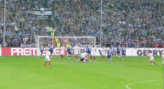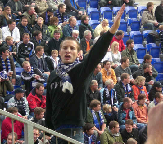 Erwähnen muss ich jetzt mal den Jojo von den Chosen Fews, Block 22C in Hamburg, der Einpeitscher, Anheizer, wie auch immer. Der Bursche gibt sich ja eine Mühe, sagenhaft. Diesen Samstag durfte er nicht nur seinen Stehplatz Block einheizen, nein, auch unseren Sitzplatzblock gleich nebenan, wobei wir alle die ganze Zeit gestanden haben. Er hat es geschafft!!! Gut gemacht, weiter so. Vom Spiel bekommt er am allerwenigsten mit. |