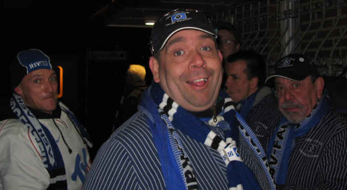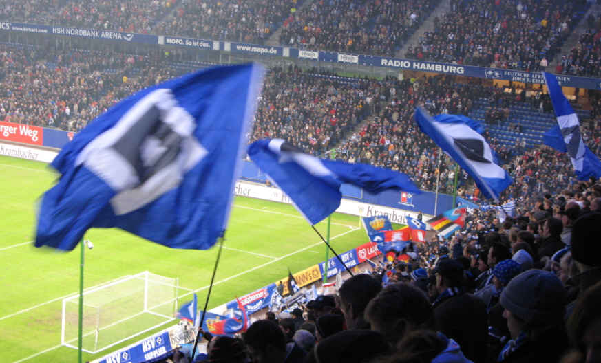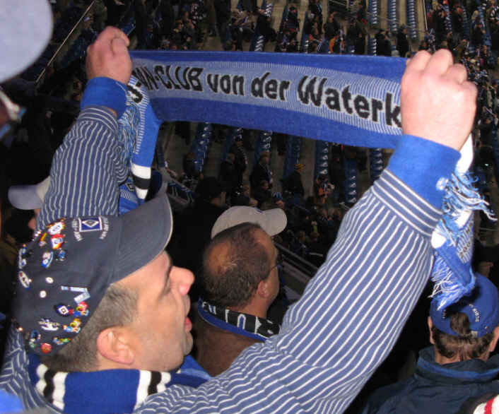 WIR GEHEN VORAN ALS EUER 12. MANN; DURCH REGEN UND WIND; DURCH STURM UND SCHNEE; HSV OLE, OLE; OLE SUPER HAMBURG OLE, SUPER HAMBURG OLE. |