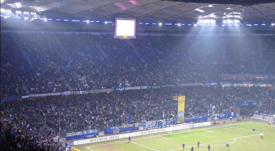 Oben ein Blick von der Südtribüne auf "unsern" Block 28B In der Mitte ist unser Frank an der HSV-Weihnachtsmütze schemenhaft zu erkennen. | |||