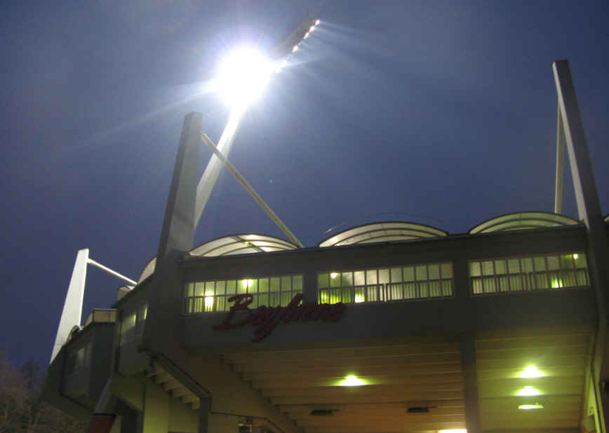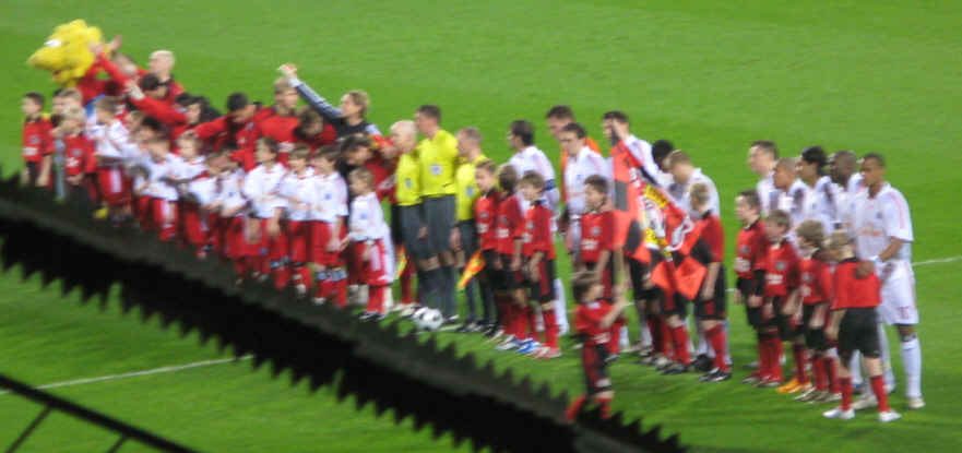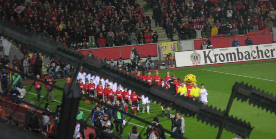 Einmarsch der Gladiatoren etwas ungewohnt aus der Stadionecke. Ein wenig merkwürdig ist auch der Nato-Draht, mit dem der Gästebereich abgegrenzt wird. Ich hoffe der verschwindet beim Umbau des Stadions. | |||||