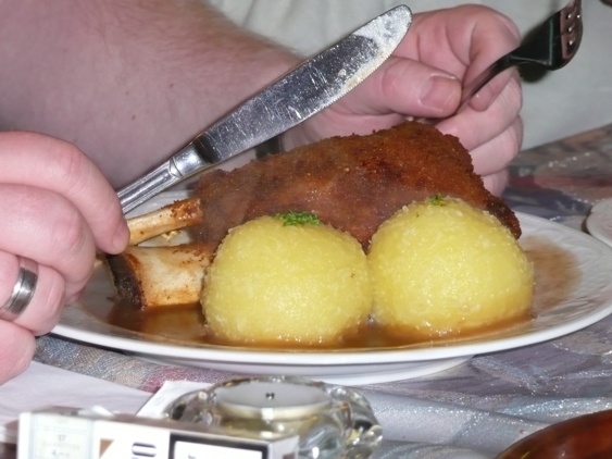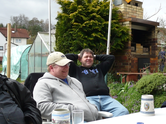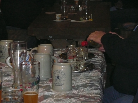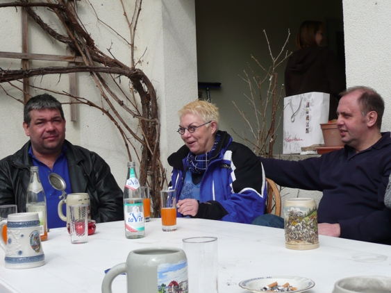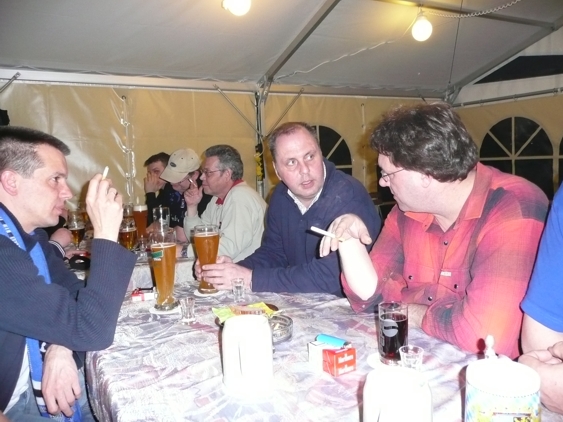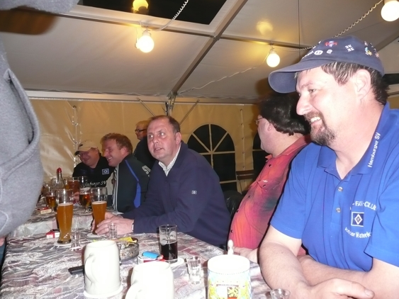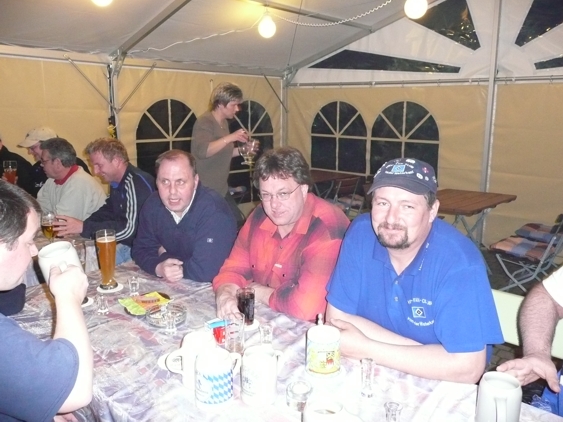 Als wir pünktlich angekommen sind in Mürsbach, wurden schnell die Doppel- und Einzelzimmer verteilt, wobei die Einzelzimmer sehr beliebt waren :-) Danach ging es zu Rainer, wo wir auch noch Regi und Michael begrüßen konnten. Nun mussten wir uns sputen, da um 19.30 Uhr ein Tisch in der "Itzgrundklause" für uns bestellt war. Im beheizten Festzelt genossen wir unsere Weizenkaltschalen und die großen und leckeren Gerichte, wie z.B. die Haxe oder Jägerschnitzel. | |