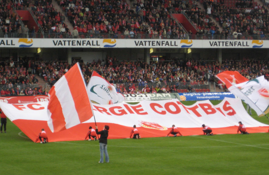 Nach einem schönen Wochenende in Cottbus, Samstag bei strahlendem Sonnenschein ein Fußballspiel von Georgs Sohn Marcel in der C-Jugend geschaut (6:2 gegen Falkensee-Finkenkrug), anschließend in der Stadt über den Herbstmarkt gelaufen und Eis gegessen, Bundesliga-Konferenz auf Premiere geschaut und dann den Abend beim Griechen ausklingen lassen, Sonntag herrliches Frühstück, Spaziergang an der Spree ging es am Nachmittag mit Georg und Marcel ins Stadion der Freundschaft.