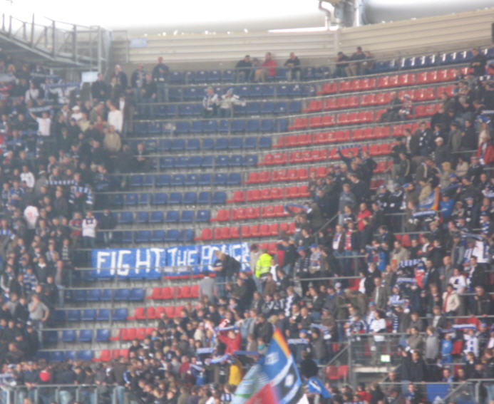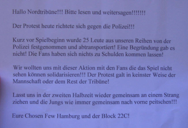 10 Minuten nicht auf ihren Plätzen gestanden. "Fight The Police" stand auf dem Plakat. Später wanderte dann unten stehendes Papier durch die Ränge. |