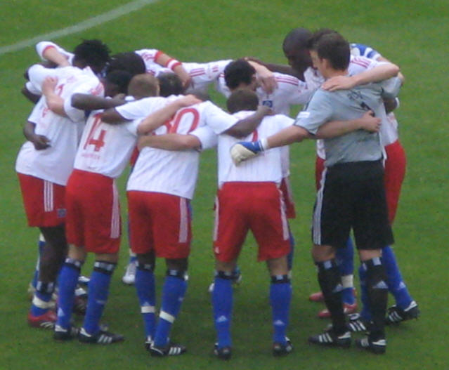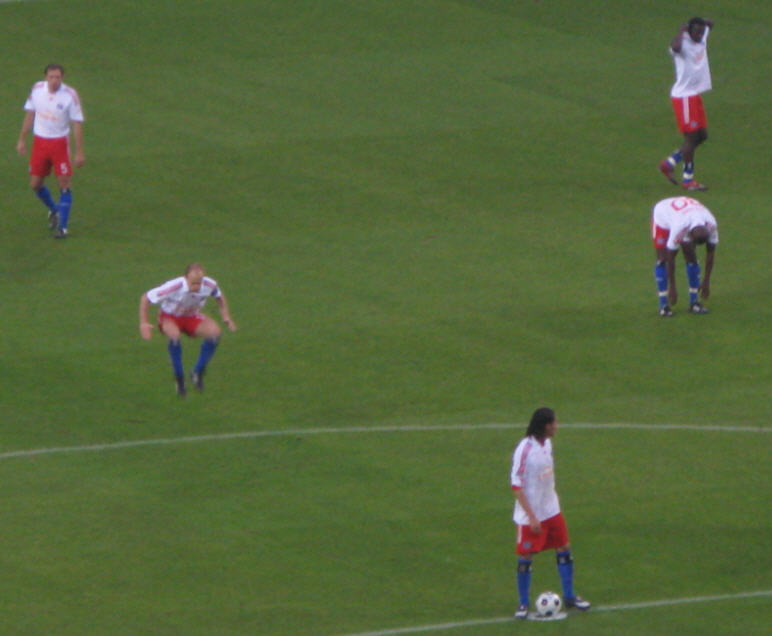 Die Hamburger beim Anstoß zur zweiten Hälfte, schon etwas unterschiedliche Methoden sich fit zu machen.Dehnen, Springen oder einfach nur in der Gegend herum schauen. | ||
