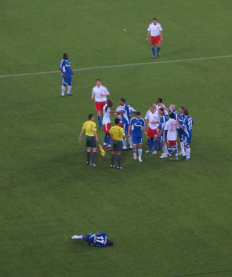 Bild oben steht stellvertretend für die letzte Viertelstunde im Spiel. Ständig lag ein Schalker am Boden und es gab eine Unterberechung nach der anderen. Was solls! Wir haben heute im Volkspark ein gutes Bundesligaspiel gesehen! Der HSV ist