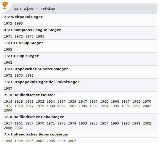HSV gegen Ajax! Das hätte auch eine CL-Partie sein können... ...vielleicht sieht man sich ja im nächsten Jahr in der Königsklasse wieder. Heute Abend also das Gastspiel vom Amsterdamsche Football Club Ajax in der Gruppenphase des UEFA-Cups 2008/2009. Der derzeitige Tabellendritte der Eredivisie ist nicht nur im holländische sondern auch im europäischen Fußball - früher zumindest - ein ganz Großer gewesen. Die Erfolge sind schon beeindruckend.