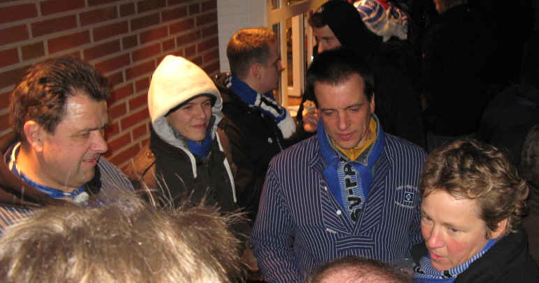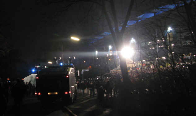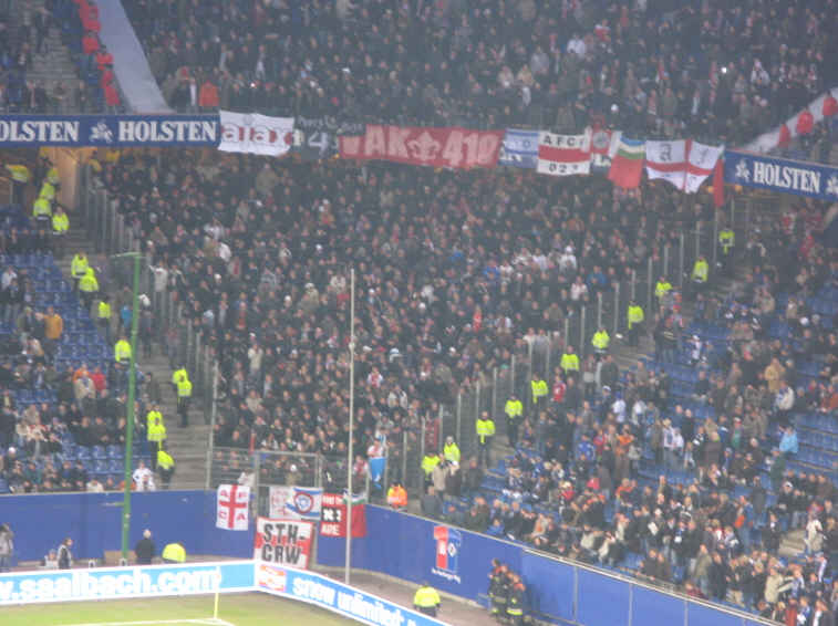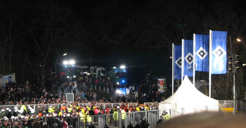 Ich denke da eher an das Verhalten der Gästefans. Entschuldigung - die wahren Fans der Gäste waren sicherlich in Ordnung - ich meine die Kriminellen, die unter dem Deckmantel der Sportveranstaltung seit dem Nachmittag die Reeperbahn terrorisiert haben und für einen Aufmarsch der Ordnungskräfte gesorgt haben, dass man meinen konnte die Zeiten der Auseinadersetzungen um die Hafenstraße wären wieder aufgelebt. Hier ein paar Impressionen vom Gästeeingang: |