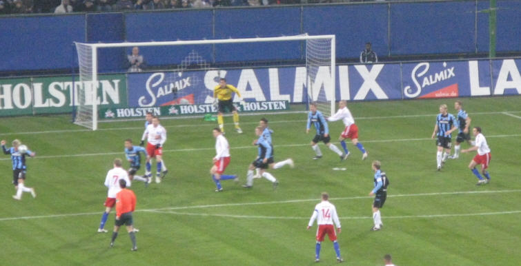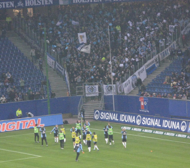 Das war neu heute. "Hamburg meine Perle" mit Untertiteln... Und als Einlaufmusik der Rothosen wurde vor dem Spiel auch nicht meht "HSV Forever" gespielt. | ||