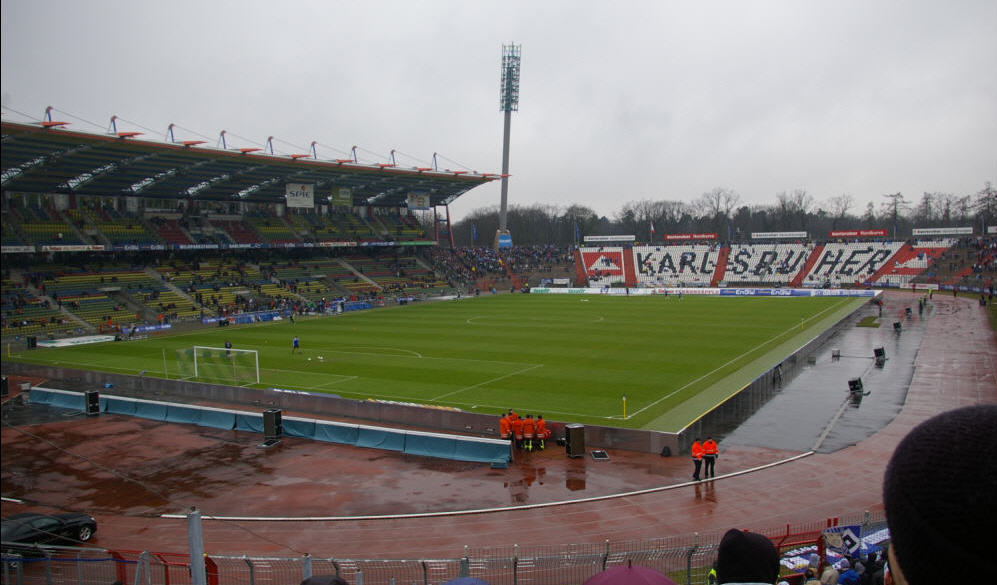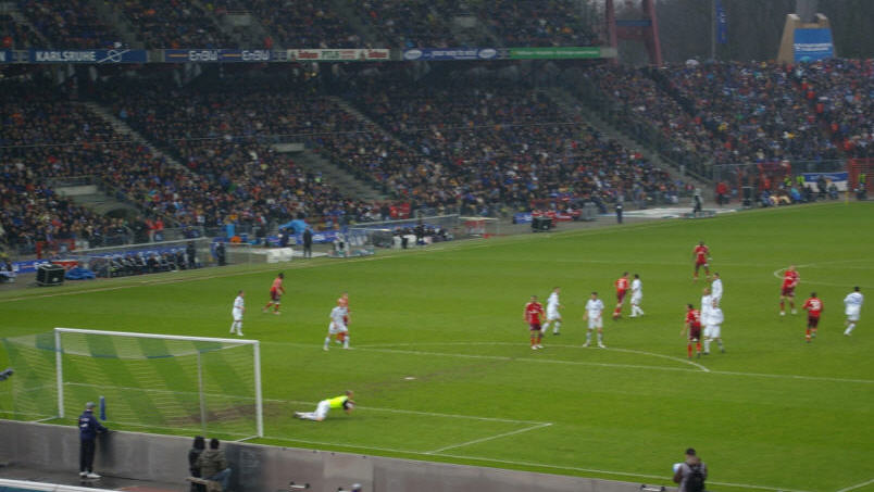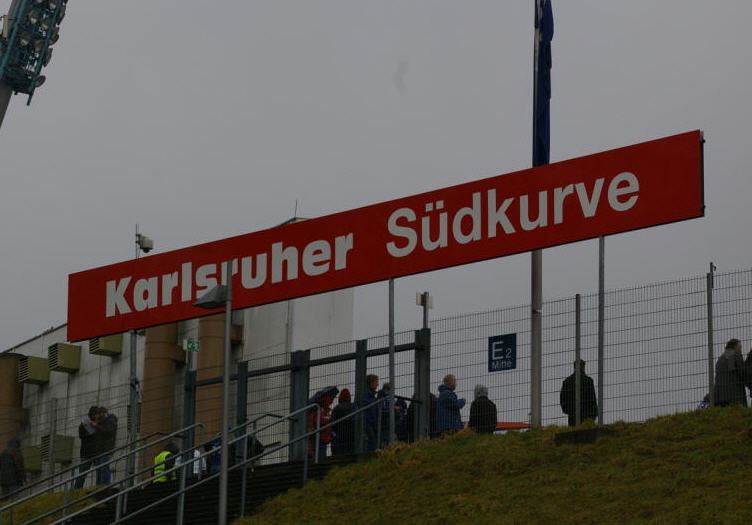 Gegen 13:20 waren dann auch Regina und Michael eingetroffen , sodass es per Straßenbahn + Buss-Shuttle zügig zum Stadion ging. Obligatorisch versuchten wir einen FAN-SHOP des KSC außerhalb des Stadions zu finden, gab keinen. Lediglich in der Nordkurve des Wildparkstadions gab es eine alte Holzbude , ein freundlicher Ordner lies mich dann zum kurzen Einkauf hinein.