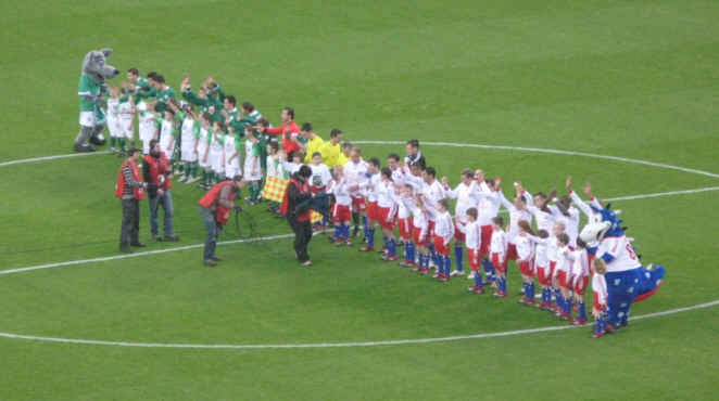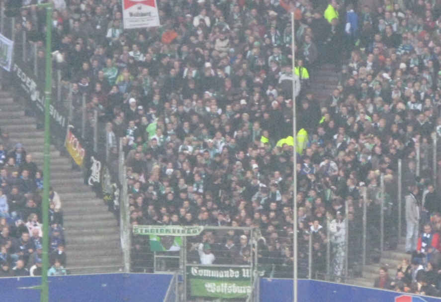 Alle waren guter Hoffnung, dass unser HSV am Ende des Spieltages wieder die Tabellenspitze bekleiden könnte. Es war jedoch erstaunlich wie viele Fans des VfL es in das ausverkaufte Volksparkstadion geschafft hatten. Respekt, langsam mausern sich die Autostädter. Vor wenigen Jahren war der Gästeblock nicht so gefüllt wie am heutigen Tage. | |||