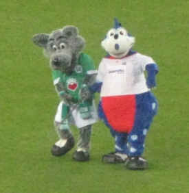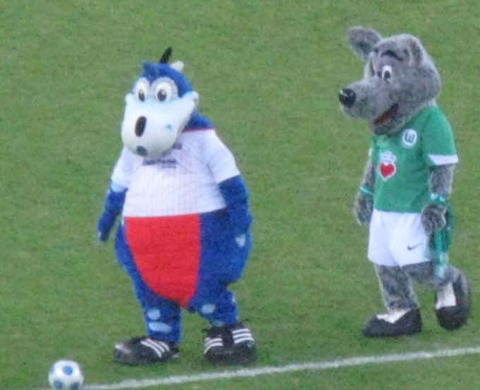 beiden Maskottchen der Mannschaften nahmen in der Halbzeit den Spielausgang