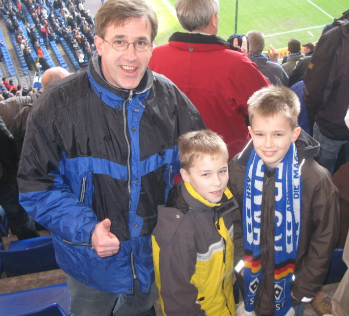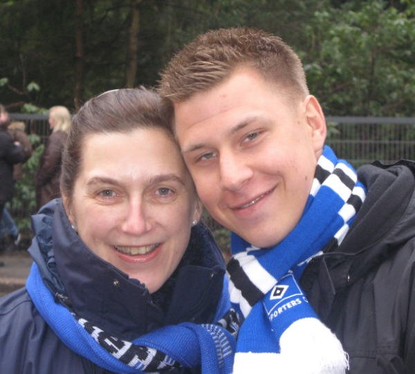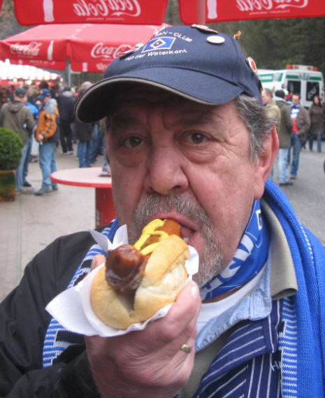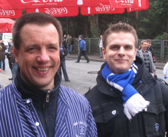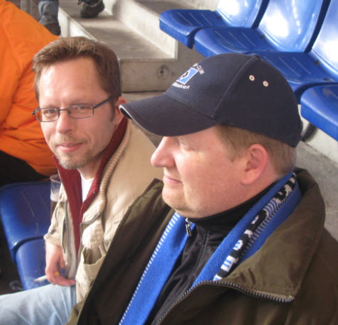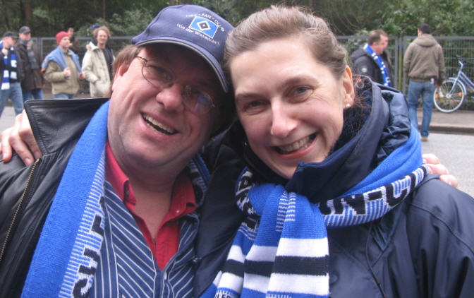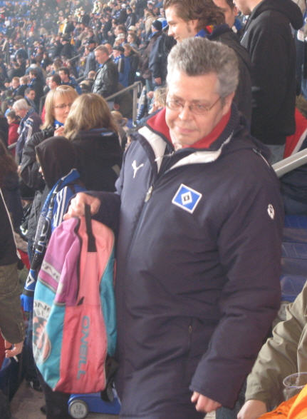 Iris mit Gladdie, der erhebliche Probleme hatte rechtzeitig beim Spiel zu sein, da es Störungen im S-Bahnverkehr gab und Horst stärkt sich noch einmal vor dem Gang ins Stadon. | |||