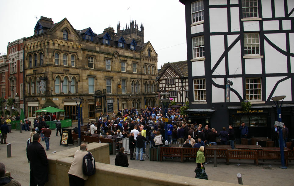 1:20 Stunde später dann die Ladung in Manchester und schnell per Busshuttle in die Innenstadt. Die Wünsche der Fans waren unterschiedlich, einige wollten einen Rundgang durch die Pubs, andere tranken Ihr Bier auf der Straße, wir hatten uns für einen Besuch des MANU Stadions OLD Trafford entschieden. Mit der Straßenbahn ging es in die nördlichen Ausbezirke, hier erinnert Manchester eher an das grau in grau von Duisburg Industriehafen ….. |