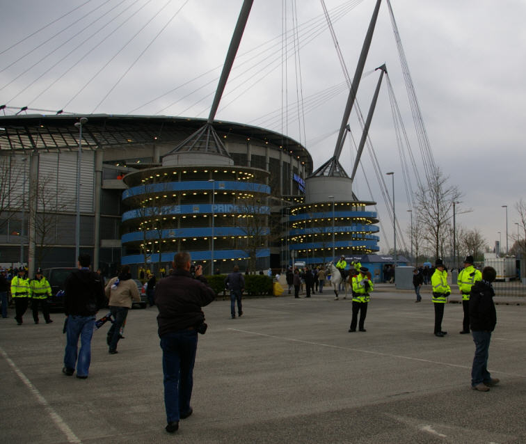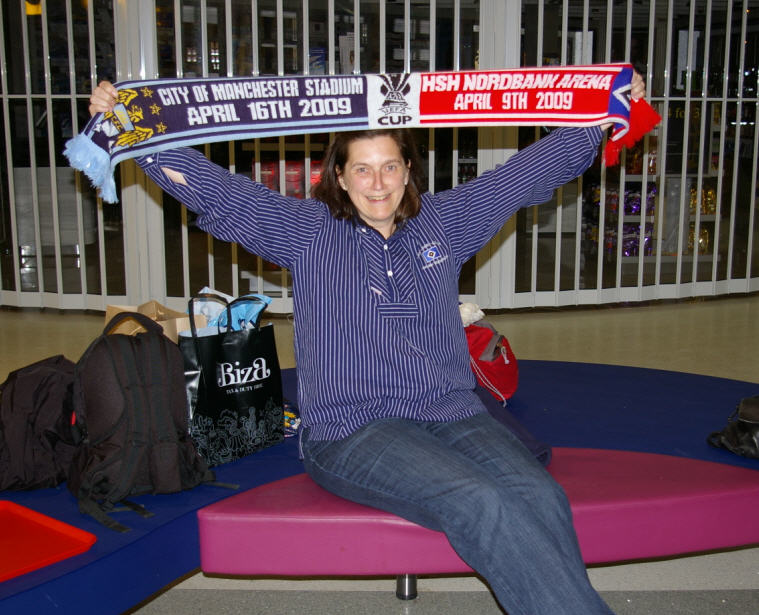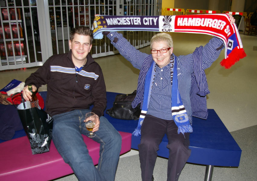 Die Atmosphäre in der gesamten Stadt war übrigens total entspannt, überall standen HSV-Fans und City-Fans zusammen und tauschten Ihre Fußball-Weisheiten aus. Um 18:00 dann ab per Bus-Shuttle zum Stadion. Ein blitzsauberes neues Stadium , nicht vergleichbar mit der Bruchbude aus Istanbul. Vorweg ne Runde Merchandising, Schal, Pin und Programmhefte etc. wurden gekauft, und ab ging es ins Stadion. |