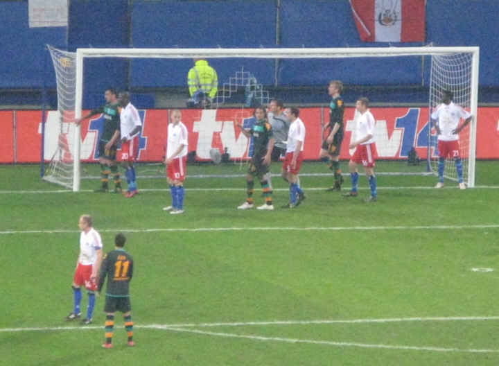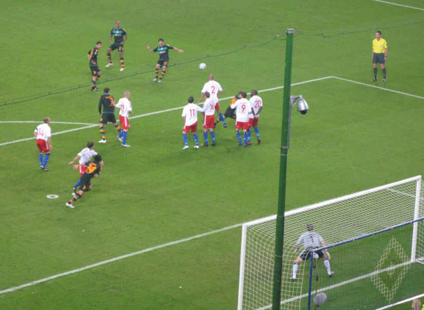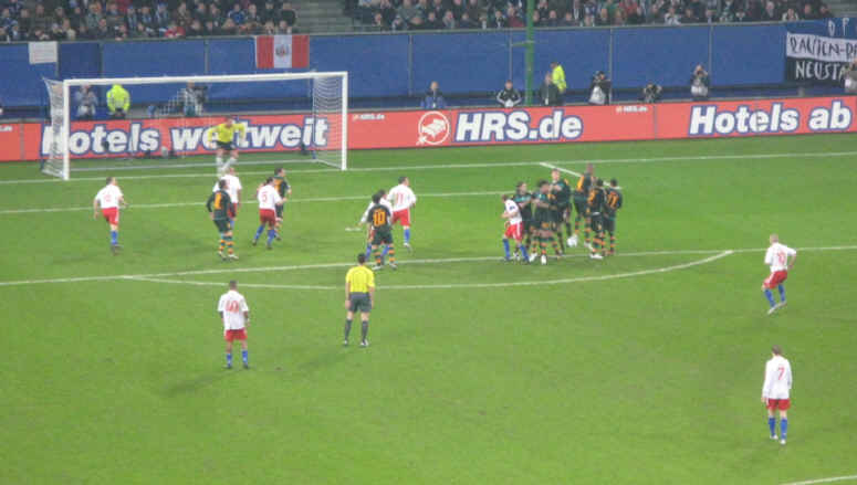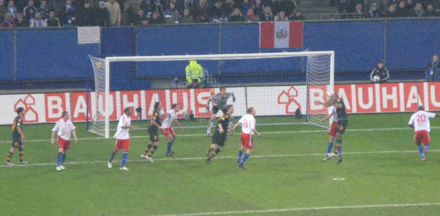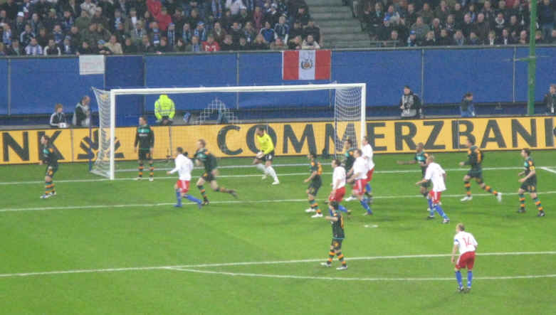 Der Schiedsrichter pfiff vor allem in der Anfangsphase sehr viele Fouls gegen die Hamburger. Daraus resultierte in der 11. Minute ein Freistoß in Diegoentfernung. Der folg an das Lattenkreuz, prallte ab und Per Mertesacker brachte die Gäste 1:0 in Führung. | |||
