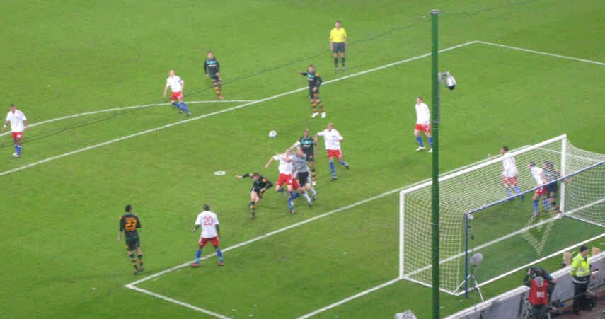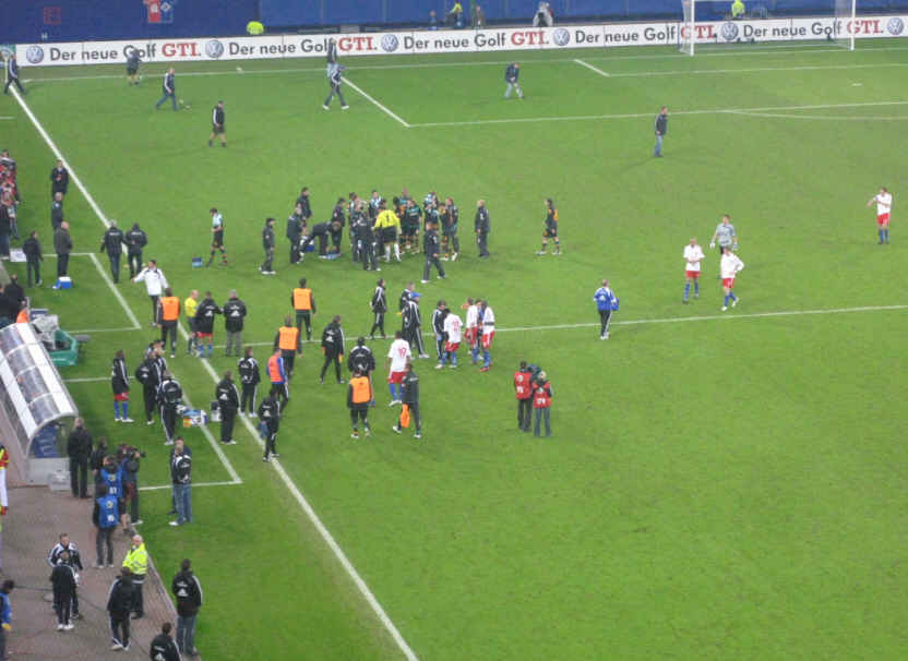 Bis zum Ende der regulären Spielzeit bleib es beim Unentschieden. Also durften wir 30 Minuten Verlängerung genießen. Leider kassierte unser Kapitän Jarolim für ein grobes Foul in der 90. Minute die rote Karte. Somit ging es in der Verlängerung nur mit 10 Hamburgern gegen 11 Bremer. | |||